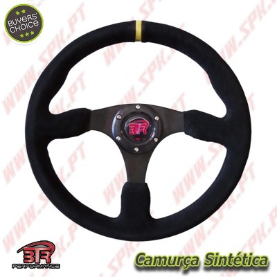 Volante plano em camurça sintética preta com acabamento amarelo e costura negra.